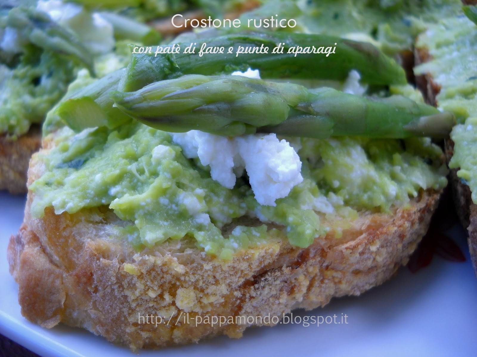 Quindi oggi ricettina sciuè sciuè…facile, veloce e d’effetto: crostone rustico con patè di fave e punte di asparagi. Ideale come antipasto e perfetta per accompagnare un aperitivo.