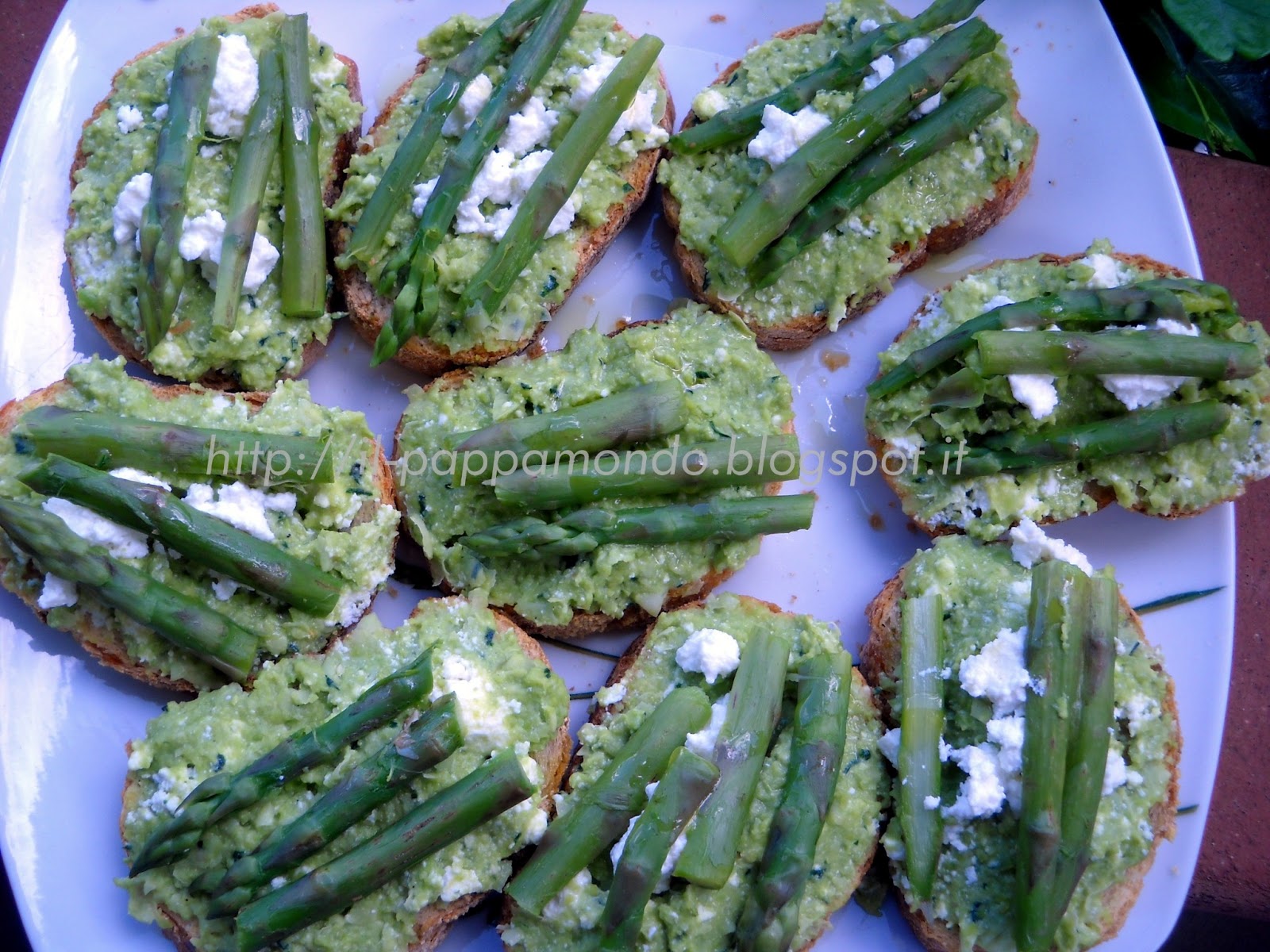 - Distribuirci sopra il paté di fave, coprire con una cucchiaiata di ricotta e decorare con le punte di asparagi.